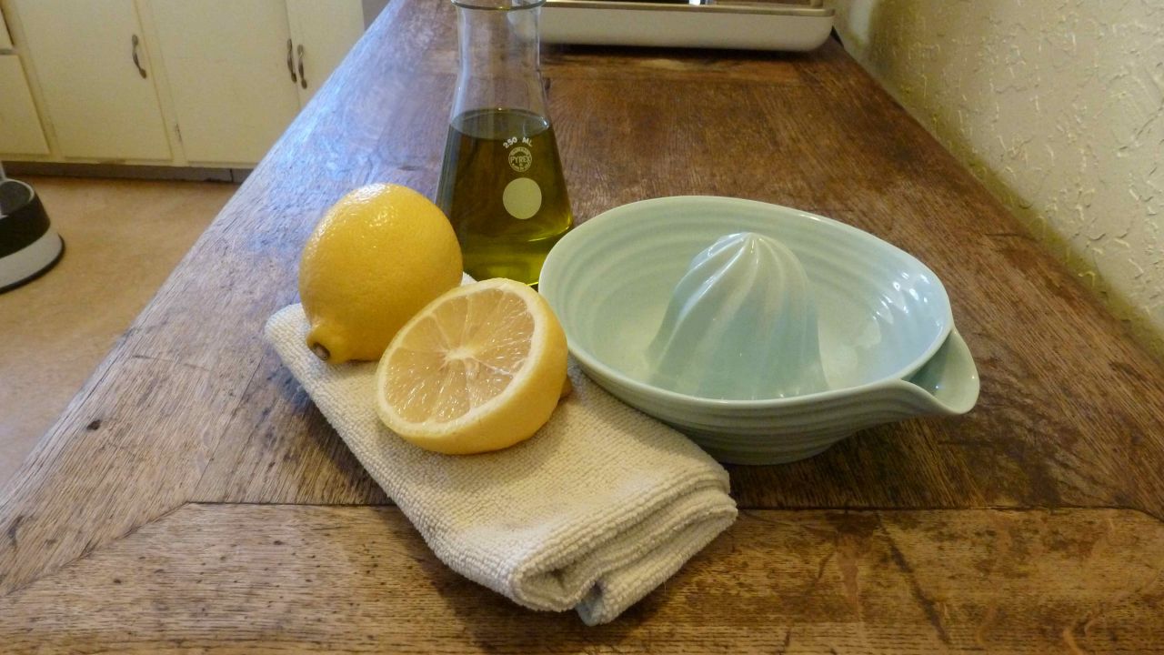 Next, I attack my antique kitchen worktable. It's dry, cracked and needs some love. Some petroleum-derived ingredients found in conventional furniture polish are capable of damaging DNA and are linked to cancer. Snow's DIY furniture polish  is a fragrant, luscious green - and good enough to eat.