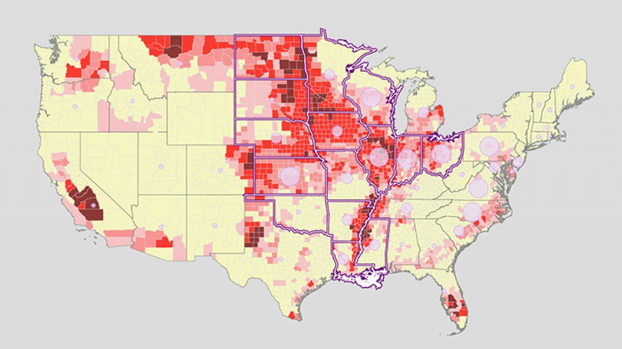 Zones within 200 feet and 1,000 feet of each school were delineated using the school’s point location in the ESRI data, not the physical footprint of the school grounds. As a result, EWG’s analysis may over- or under-estimate the exact distance of school grounds to the boundaries of nearby corn or soybean fields. School locations were evaluated for proximity to the boundaries of corn and soybean fields as delineated in the USDA 2013 cropland data layer (30-meter resolution).