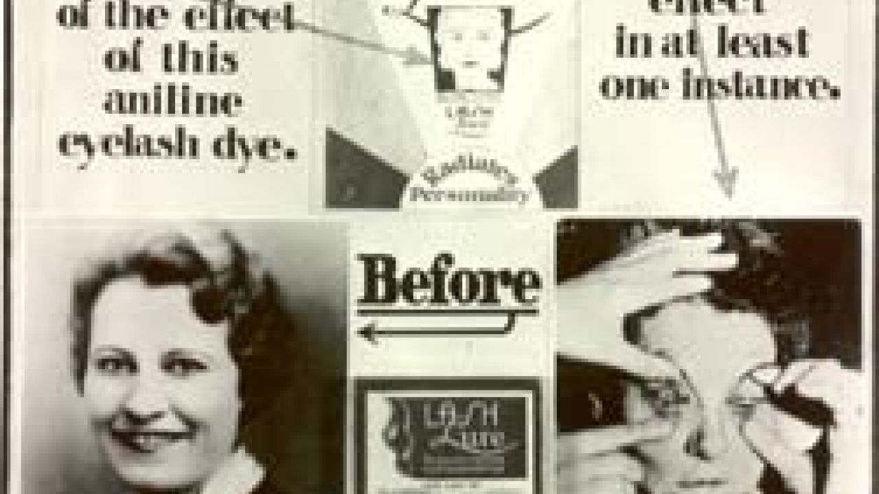 In 1933, a woman was hospitalized with excruciating eye pain. Doctors watched in horror as her eyes were eaten away as though by acid. The culprit turned out to be an eyelash-darkening treatment called Lash Lure, which contained paraphenylenediamine, a toxic coal tar dye. [Image credit: FDA]